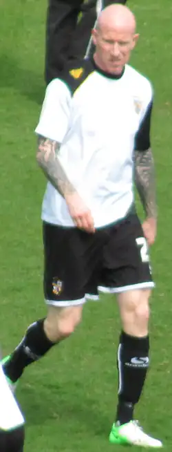 Hughes was sold to Gordon Strachan's Coventry City for a club record transfer fee of £5,000,001 (the unusual figure was because any offer exceeding £5 million would trigger an escape clause in his West Brom contract) in August 2001.[30][31] His wages at Highfield Road were reported to be £15,000 a week.[32] Hughes scored 14 goals in 40 games, including a hat-trick in a 6–1 win at Crewe Alexandra, and finished the 2001–02 season as the club's top-scorer.[33] Coventry rejected a loan offer from West Bromwich Albion in March 2002, and ended the season outside the play-offs.[34]