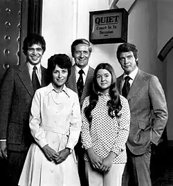 Owen Marshall cast, 1973. Back, L-R: Reni Santoni, Arthur Hill, Majors. Front: Joan Darling and Christine Matchett.