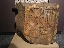 The cross contains the most complete example of a number of depictions of the legendary smith Weland and Beaduhild, the mother of his child, from tenth-century Yorkshire.[6][2][3] Weland, in both Scandinavian culture and Anglo-Saxon culture, is commonly used as a heraldic figure, often associated with victory.[2] This symbolism is rooted in the mythical figure's quest to gather the stone that assured King Nithad’s victory,[2] with depictions of him on carvings such as the Leeds Cross usually referring to a recent military victory. [2] Weland's presence upon this carving likens him and Christ as fellow heroes in a culturally significant attempt to draw similarities between the two. [2] The Leeds Cross contains interlaced vine decor throughout and consistently, but further analysis of the iconography beyond the figure of Weland, remains unclear. [2] Scholars such as McGuire and Clark, as well as James T. Lang, believe there are multiple Christian figures including several Evangelists depicted in the carving, while others, such as Robert Halstead, believe there are fewer Christian figures.[2] While the precise nature of each figure is less than definite, what is agreed upon is that the Cross contains at least one of the Evangelists. However, the exact number and identifications are highly debated by McGuire, Clark, and Halstead. St. John the Evangelist stands out as the most identifiable Evangelist while other figures such as Saint Luke and an angelic presence are debated upon.[2] Celestial figures other than the Evangelists are slightly more certain, with the Holy Spirit in the form of a dove being the clearest familiar icon. [2]
