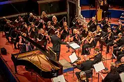 The concerto finals have been supported by a number of major UK orchestras over the years including the Royal Liverpool Philharmonic, the City of Birmingham Symphony Orchestra and the Hallé. Sir Mark Elder has conducted the Hallé Orchestra at all the finals since 2003, with the exception of 2018 when the conductor was Edward Gardner. Other conductors with long associations with the Competition have included Sir Charles Groves and Sir Simon Rattle. The Terence Judd Hallé Orchestra Prize, selected and awarded by the orchestra to one of the six finalists, was awarded in 2012-2018. A new partnership with the Royal Liverpool Philharmonic Orchestra was announced in 2019 for the 20th Edition in 2021, and the orchestra awards the Royal Liverpool Philharmonic Society Prize for the best performance of a contemporary work. Following this award in 2021 to Gold Medallist Alim Beisembayev, the RLPO commissioned a piano concerto from the distinguished composer, Eleanor Alberga.