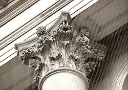 Whatever the council's doubts in the early days, it now appeared determined that nothing was too good for their Town Hall. They provided finance on an unprecedented scale, for mayor's reception rooms described by the historian Derek Linstrum as "splendidly furnished",[54] portraits of William Wilberforce and Charles James Fox, and a marble medallion of Napoleon III and Eugénie.[54] Brodrick participated in all the details of decoration in the public rooms, which each had their own character, though the richest effects were reserved for the Council Chamber in the southeast corner (now known as the Albert Room), which, in addition to the coupled fluted pilasters and ornamented frieze, has an elaborate ceiling incorporating delicately painted glass panels. Though Brodrick's red Morocco upholstered furnishings and the original gallery were removed in the 1930s, the room is a characteristic example of a Classical form of decoration which evidently appealed to Brodrick. Unique variations to the decorative capitals of the interior were devised by Brodrick to express the town's history, including such motifs from the coat of arms of Leeds as pairs of owls, and the ram's head, symbolising the golden fleece on which the prosperity of Leeds was based.[55]