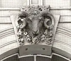 The sculptor credited for the general carving work on the building is Catherine Mawer,[12] whose stoneyards were in Oxford Place on the west side of the building, and George Street (now Great George Street) on the north side.[14] Her nephew William Ingle, who ran the stoneyards,[15] carved all the sheep head reliefs, which represent the fleece. He was also responsible for the team that produced the general architectural sculpture.[16]