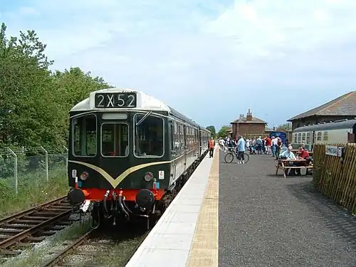 Plans are for passenger trains to eventually continue through Leeming Bar and run into Northallerton railway station. The first phase of this involved re-opening Scruton station and commissioning a temporary structure at Northallerton West in 2014, but this section was closed again in August 2016 following a collision between a train and a car at a level crossing near Yafforth.[9] It is hoped to recommence services to Northallerton West at a future date once work to upgrade level crossing equipment is complete, although there are no current plans to do so.[10] Scruton station later reopened and is currently the eastern terminus of the line, served by shuttles from Leeming Bar.