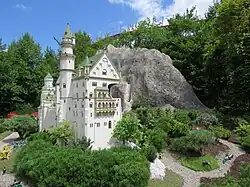 Miniland contains 1:20 scale recreations of various European cities and landscapes such as Berlin, Frankfurt, Venice, Swabian Village, The Netherlands, Hamburg Harbour, the Neuschwanstein Castle and several tall buildings from around the world including Legoland's own observation tower which is also to scale.[30] All of the recreations were built entirely of 25 million Lego bricks.[10] Many of the people, animals and vehicles can be moved by hitting a button.[31] Miniland also housed several Star Wars models: seven scenes reproduced from the franchise, including large Yoda and Darth Vader models.[32] These Star Wars models were removed after the 2019 season.[33]