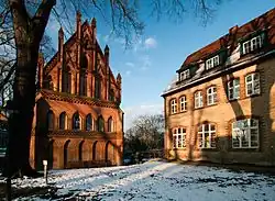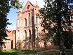 Lehnin Abbey (German: Kloster Lehnin) is a former Cistercian monastery in Lehnin in Brandenburg, Germany. Founded in 1180 and secularized during the Protestant Reformation in 1542, it has accommodated the Luise-Henrietten-Stift, a Protestant deaconesses' house since 1911. The foundation of the monastery in the newly established Margraviate of Brandenburg was an important step in the high medieval German Ostsiedlung; today the extended Romanesque and Gothic brickstone buildings, largely restored in the 1870s, are a significant part of Brandenburg's cultural heritage.