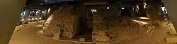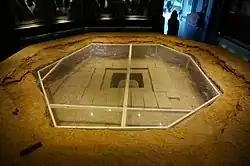 The main entrance of Leifeng Pagoda features a golden plaque inscribed with the character "Leifeng Pagoda" by the calligrapher Qigong. The ground is paved with glass and beneath it lies the protective layer of the Leifeng Pagoda site (i.e. the foundation).[24]
