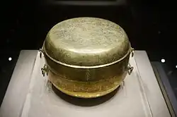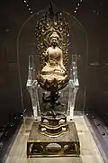 The former was placed in the earthly palace and contained a gold vessel wrapped in a thin gold sheet in the form of a coffin, the details of which are unknown as it was not opened, and was believed to contain the relics of the Buddha's bun hair; the latter is thought to have been placed in the heavenly palace and a gourd-shaped gold vase, which also contained the relics, was suspended inside the tower.[11][28]