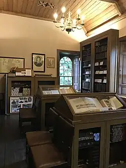 The two-storey building consists of one apartment which is entered from a stone staircase, beneath the apartment are two vaults which have previously been used as a plasterer's store and at a later point as a painter's store.[5] The library is lit by three windows, two to the west of the building and one to the south, it is a wood lined library with sixteen bookcases lining the walls and low presses for books stand in the centre of the room.[5][3] The fore-stair into the building had originally run from east to west but at the start of the 19th century it was changed to run north to south.[5]