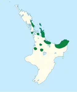 Currently the species survives in fragmented populations across the North Island between Whangārei and the Waikato Region, and can also be found on Great Barrier Island.[13]