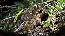 Hochstetter's frog has a brown-green to brown-red top with dark bands and warts, yellow-brown bellies. Males grow to 38 mm (1.5 in) and females 50 mm (2.0 in) snout–vent length. They are nocturnal, staying under refugia during the day. Hochstetter's frog prefers moist gaps under shaded debris, like rocks and logs and along streams and seepages in native temperate rainforest.[6] They are carnivorous, preying on invertebrates such as spiders, beetles, and mites.[7] All native New Zealand frogs (pepeketua in Māori) share tail-wagging muscles, inscriptional ribs, round pupils, and a lack of eardrums, eustachian tubes, and vocal sacs. These frogs, in some ways more similar to salamanders than modern frogs, use chemical signals over acoustic signals to mark habitat and recognize competitors.[8] Hochstetter's frogs poor hearing is complemented by their lack of vocalization.