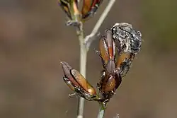 The males are relatively short lived and have little impact on pollination, but the females intentionally collect pollen by accumulating pollen in the hairs around the head and thorax while feeding on nectar before moving it to the scopae.[8] This morphology allows pollen to be more effectively spread between flowers than other potential pollinators such as other insects and birds.[12]