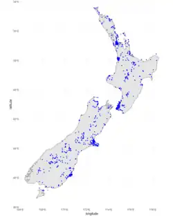 | Distribution map of iNaturalist Leioproctus spp. sightings. (All 9 NZ species, not just L. imitatus) | |