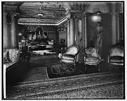 The house was built at an estimated cost of $125,000 by general contractors J.E. and A.L. Pennock, who had also built the nearby Administration Building, Carnegie Institution of Washington.[3][4] The cream-colored neoclassical house made of terracotta bricks and gray stone was three stories tall not including the basement, was 96 feet (29 m) long, 75 feet (23 m) wide, 62 feet (19 m) tall, and contained 55 rooms.[3] The entrance with an elaborate porte-cochère faced New Hampshire Avenue and not the traffic circle. Instead a two-story alcove with balconies and balustrade faced Dupont Circle. After entering the house there was a large vestibule. To the right was a large marble stairway leading to the great hall, which was 75 feet (23 m) long and 28 feet (8.5 m) wide, and to the left a stairway leading to the basement. Off the great hall was the wood-paneled music room which featured a large fireplace and ceiling panels. This room faced 19th Street and measured 65 feet (20 m) long and 32 feet (9.8 m) wide. Also off the great hall was the entrance to two rooms that overlooked Dupont Circle. At the end of the first floor vestibule was a stairway leading to a large landing featuring an ornate stained glass window. The entrance to the dining room was to the right of this stairway. Continuing up the stairs to the second floor led to another large hallway almost the length of the one found on the first floor. The same stairway led to the third floor.[5] An elevator was later installed in 1902.[3] The bedroom for one of the Leiter daughters was described as being Louis XIV style, featuring eight French paintings, carved woodwork, a white marble ceiling, and an elaborate fireplace. The family moved into their completed house in 1893.[2][6]