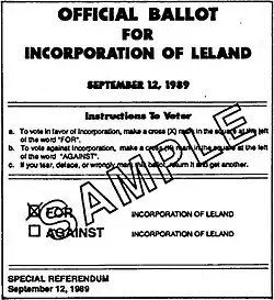 The citizens of Leland voted down an attempt at incorporation in 1979. Leland was ultimately incorporated as a town on September 5, 1989, in a passing vote of 472–42. After the ordinance passed to incorporate the town of Leland, Leland was governed by twelve members of the Leland Town Charter Commission until Election Day of 1989. Leland has been governed by a mayor-council government since its first general election.[10]