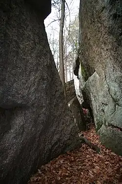 The Lemon Squeezer is an unusual rock formation in Harriman State Park, New York. It is located at the intersection of the Appalachian Trail (White) and the Arden-Surebridge Trail (Red Triangle), near the base of Island Pond Mountain in the town of Tuxedo.