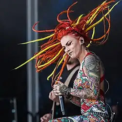 She is also known for her tattoos and she has tattoos of her vocal influences on her leg with one being Mitch Lucker of Suicide Silence and the other being Chino Moreno of Deftones.