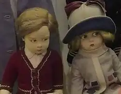 The bodies and clothing of Lenci boy and girl dolls are made of pressed woolen felt. The bodies were machine stitched up the back and across the shoulders then hand stitched between the legs. This allowed them to wear low cut tops and clothes that displayed their limbs. The faces were pressed on moulds, and features were then hand-painted. The hair was made from mohair and stitched in.[1] Felt pressed dolls were very popular in the nineteenth century and just after the First World War. The eyes face sideways, giving the boys a sullen expression and the girls one of loneliness. These dolls have Lenci stamped into the felt of the foot. They were produced in various sizes, and sold with various costumes or uniforms. Of the two dolls in the Judges' Lodgings museum in Lancaster, England the boy is in a burgundy cardigan, and the girl is in a blue hat and coat.[2] They were purported to have been made in the memory and image of a deceased daughter.