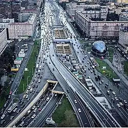 After crossing Small railway ring Leningradskoye Highway enters Golovinsky District. There is an interchange with Golovinskoye Highway near Vodny Stadion metro station. Until 2008 this crossing was served by traffic lights. That was the last traffic light on the highway.