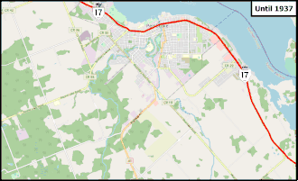 Within Pembroke, Highway 41 entered the town as it does today, but curved northwest onto Boundary Road to avoid crossing the Muskrat River. It followed Boundary Road to end at Highway 62 (Bruham Avenue).[51] In 1962, the route was redirected to downtown Pembroke via Eganville Road and Christie Street to end at Highway 17/62 (Pembroke Street West).[52] This routing remained in place until the Highway 17 Pembroke Bypass opened on September 10, 1982, after which the current path of Highway 41 along Paul Martin Drive, River Road and Mackay Street was established. The former route of Highway 17 along Pembroke Street was subsequently renumbered as Highway 148.[53][54]