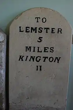 Leominster (/ˈlɛmstər/ ⓘ LEM-stər) is a market town in Herefordshire, England; it is located at the confluence of the River Lugg and its tributary the River Kenwater. The town is 12 miles (19 kilometres) north of Hereford and 7 miles (11 kilometres) south of Ludlow in Shropshire. With a population of almost 12,000,[2] Leominster is the largest of the five towns in the county; the others being Ross-on-Wye, Ledbury, Bromyard and Kington.