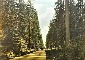 Among his diverse range of subjects, he took early pictures of motorized logging.[23] Frank also photographed British royalty throughout his career. In 1920, he began to take publicity photographs for the Canadian Pacific Railway,[24] becoming in the next year the official photographer of their western lines.[25] A major commission from the same company, in the years 1924 to 1926, was to record the construction of piers "B" and "C" in the Vancouver harbour.[26] In 1924, he produced a booklet of postcards recording British Columbia timber scenes.[27]