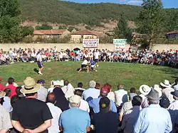 Leonese wrestling bouts occur in the corro, a circle of 12 to 18 metres (39 to 59 ft) diameter.[1] The corro is traditionally a grassed area, but bouts can now occur on mats.[2]