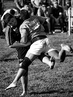 The name "aluche" is possibly of Celtic origin.[2] Leonese wrestling was spread throughout Iberia by Leonese shepherds in their seasonal migrations. The style became known by various names through the region, including Lucha de la Cruz in Salamanca; vueltas or marañas in Muga de Sayago; luchas or trinchas in Zamora; Lucha in La Moraña (Ávila); galhofa in the north of Portugal; valto in the La Lomba, León; altío or aluchas in La Cepeda; and lucha in the Palencia mountains and Saldaña.[3]