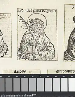 According to the Christian historian Eusebius, Leonides' son was the early Church father Origen.[1] Eusebius also says that he was of Greek nationality.[1] In the same passage Eusebius tells us that Leonides was martyred during the persecution of the Roman emperor Septimius Severus in the year 202 AD. Condemned to death by the Egyptian prefect Lactus, he was beheaded, and his property seized.[2]