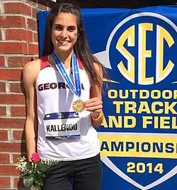 Earlier in the outdoor season, Kallenou won gold at the SEC Championships by clearing 1.92 m. at Lexington, Kentucky, a jump that is also a Cypriot National Record. In the event, she cleared all five of her attempts on the first try to win her first outdoor high jump title. A week earlier, on May 10, Kallenou cruised to victory at the Georgia Invitational by setting a then-national record (her first) of 1.91 m. Following her very successful outdoor 2014 season (NCAA and SEC champion), she was named in the First Team All-America and the All-SEC First Team.