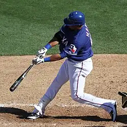 For the Express, Martín batted .263 with no home runs, and 17 runs batted in (RBI) in 175 at bats.[10] The Rangers promoted Martín to the major leagues on August 30, 2011, when Nelson Cruz went on the disabled list.[10] Making his major league debut on September 2, Martín recorded his first MLB hit against Tim Wakefield of the Boston Red Sox.[11] Appearing in eight games for the Rangers, Martín recorded three hits in eight at bats, including one double.[12] The Rangers added Martín to their roster for the 2011 American League Division Series, but he did not make an appearance.[12]
