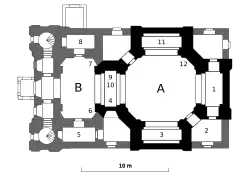 Plan of the church with construction stages color-coded: █ 1679–1693, 1717–1730