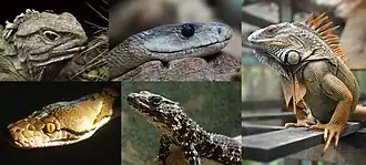 | Collage of five lepidosaurs. Clockwise from top left: tuatara, black mamba, green iguana, Smaug breyeri and reticulated python | |