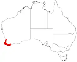 It occurs along the edges of creeks and streams and around swamps from the Perth region south through the Margaret River region and eastwards to Albany where it grows in sandy or loamy soils.[1]