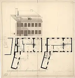 The building is 25 bays long and designed in Rococo style. Among the partly surviving interiors is a dining room with murals and door pieces by Jacob Fabris.
