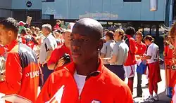The following year, George had established himself into the starting lineup; he only missed one match because of a suspension, and scored seven times that season. At the end of the season, it was announced that he had signed a contract extension with Utrecht, keeping him in the Domstad until mid-2011, despite some problems with his agent.[7][8] The forward started the 2008–09 season well, but because of growing problems with his physical shape, he lost his place in the starting eleven after a couple of weeks. After showing an unmotivated behavior, he was sent back to the reserve squad by manager Willem van Hanegem.[9] A week later his behavior had improved, and he was forgiven and put back on the first team, and since then he played a majority of the games.