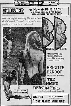 The Night Heaven Fell (Les bijoutiers du clair de lune) is an Eastmancolor 1958 French-Italian film directed by Roger Vadim. Vadim had already acquired international fame with his daring debut And God Created Woman (1956). Like its predecessor, The Night Heaven Fell explored the exuberant sensuality of Brigitte Bardot, who was Vadim's wife at the time.