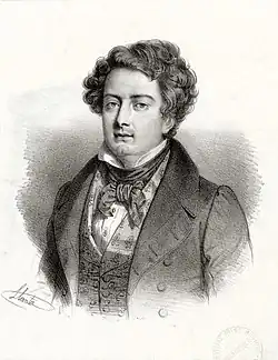 In addition, while Donizetti was in Venice for the premiere of Maria de Rudenz the following January, he had met and had been impressed with Adolphe Nourrit, who had been the principal tenor in Paris, having sung roles written for him by the major French composers such as Meyerbeer, Auber, Halévy, as well as Rossini (in William Tell) after that composer had moved to Paris in 1829.[9] However, by the late 1830s, Nourrit's popularity in Paris was in decline, and he was in danger of being supplanted in the public's affections by rising star Gilbert Duprez who the composer had tried to interest in a Paris production of L'assedio di Calais (The Siege of Calais) in 1836, but which failed to gain attention outside Italy.
