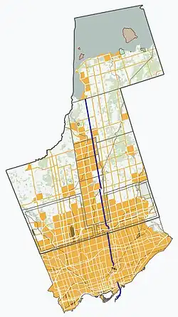 | Major junctions | Lake Shore Boulevard Queen Street Dundas Street Gerrard Street —Road breaks— (Intervening minor segment) —Road breaks— Eglinton Avenue Lawrence Avenue Sheppard Avenue Finch Avenue Steeles Avenue —Road breaks— John Street | ||||||