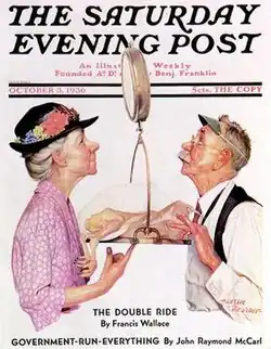 Thrasher was a realist painter, often compared to Norman Rockwell.[4] He is usually considered inferior to Rockwell, but it is noted that he had less time to develop his art.[4] While Rockwell's backgrounds were highly detailed, Thrasher's backgrounds were simply set on white.[6][2] Nonetheless, Thrasher is occasionally mistaken for Rockwell, in particular the piece "Tipping the Scales", which appeared on the Saturday Evening Post in October 1936.[6][2]