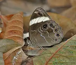 It is about 50–55 mm in expanse, with the upper surface of wings predominantly brown in colour. The forewing has a sub-apical white band and pale spot on the apex. The underside of the hindwing has a large ocellus or and a series of spots along the margin. It is found in bamboo forests.