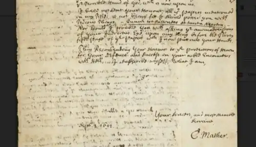 In a letter dated September 2, 1692, Cotton Mather wrote to judge William Stoughton.[1] Among the notable things about this letter is the provenance: it seems to be the last important correspondence from Mather to surface in the modern era, with the holograph manuscript not arriving in the archives for scholars to view, and authenticate, until sometime between 1978 and 1985.[2]