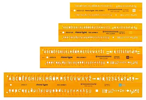 A lettering guide template is a special type of template used to write uniform characters. It consists of a sheet of plastic or other material with cut-outs of letters, numbers, and other shapes used especially for creating technical drawings. For decades they have been essential for lettering a drawing nameplate so text and other designs could be made quickly and uniformly.