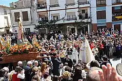 - Resurrection Sunday - Letur's "Las Cortesias" Procession. This famous celebration is held in Plaza Mayor and white doves are released. The procession starts at around 11:30 a.m., first Our Lady of Sorrows leaves dressed in mourning, she passes behind the Town Hall and the Arc of Moreras and climbs up to the Plaza Mayor. At the same time Our Father also comes from this church to the Plaza Mayor where the meeting takes place, followed by the anthem of Spain.