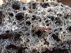 L. gongylophorus produces a diverse array of enzymes to facilitate lignocellulose degradation in ant gardens. As leafcutter ants can have such a profound effect on their environment and account for about 25% of plant consumption in their forest ecosystems[8] this means L. gongylophorus may be the primary driver of plant biomass degradation in this ecosystem.[9] The sheer scale of the ants' farming can see 10-15% of leaves in a colony's foraging range being cut and fed to the fungi[8] which results in significant carbon dioxide emissions from L. gongylophorus as this plant biomass is broken down. Nest openings can have CO2 emissions 100,000 times greater than the surrounding soils with nests and their surrounding soil emitting 15-60% more CO2 than soil without nests. Emissions were observable for more than two years after nests were abandoned with nests contributing an estimated total of 0.2-0.7% of the ecosystem's soil emissions.[10] Due to the enhanced rate of breakdown of the plant biomass facilitated by the fungus compared to the slower natural degradation of leaves that fall on the surface, leafcutter ants and their symbiotic fungi partners may play a surprisingly significant role in the ecosystem's ability to sequester carbon.