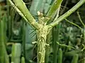 Species of Leuenbergeria grow as trees or shrubs, up to 10 m (33 ft) in the case of L. lychnidiflora. They differ from most cacti in having leaves even when mature – as also do species of Pereskia and Rhodocactus, with which Leuenbergeria species were once united in a single genus. Leuenbergeria differs from those other genera in that the stems of Leuenbergeria species form bark at an early stage in their growth and do not have stomata, preventing them from acting as organs of photosynthesis. Like other cacti, they have areoles bearing spines. In most species, the areoles also bear leaves. Their flowers are mostly pink, orange or red, although some species have yellow flowers.[3][4]