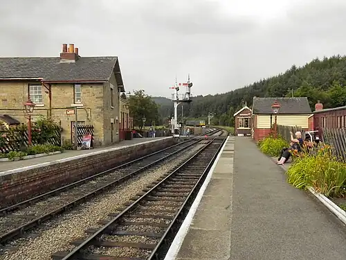 The W&P was taken over by the York and North Midland Railway in 1845 who converted it to a double track steam worked conventional railway and linked it to their new line from York to Scarborough.[2] The Y&NM built the station at Levisham on land provided by the Rector (and Lord of the Manor) of Levisham, the Rev. Robert Skelton.[3] One of Skelton's rectories (he built three) 'Grove House' stands adjacent to the station. It is thought that Skelton influenced the location of the station, which is closer to Newton-on-Rawcliffe than Levisham, although the only access to Newton was via a steep path. The logical place to build the station would have been nearly two miles further south at Farworth, where it would have served both Levisham and Lockton.