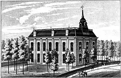 The two-story brick structure rests on a stone foundation, both believed to be of local origin. As built, the dimensions were 80 feet by 48 feet with the eaves at a height of 32 feet.[2] The first floor ceiling height was 12 feet and the second floor's 18 feet. Three bays, or rooms, were provided on each floor. Since its original construction a series of four additions and internal remodeling have taken place. The building is topped by a mansard roof covered with asphalt, and a distinctive cupola[2]