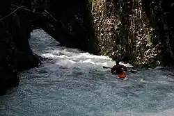 The Lewis River is a tributary of the Columbia River, about 95 miles (153 km) long, in southwestern Washington in the United States. It drains part of the Cascade Range north of the Columbia River. The drainage basin of the Lewis River covers about 1,046 square miles (2,709 km2).[4] The river's mean annual discharge is about 6,125 cubic feet per second (173.4 m3/s).[5] Unlike nearby Lewis County and Fort Lewis the Lewis River was not named for Meriwether Lewis, but rather for A. Lee Lewis, an early pioneer who homesteaded near the mouth of the river.[6]