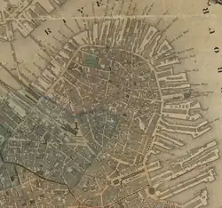 Boston was the trade center of the colonial Province of Massachusetts Bay. Waterfront property was developed as a shopping center of stores selling goods unloaded from adjoining wharfs. Property was owned by wealthy wharfingers who collected fees from ships loading or unloading cargoes and leased the stores and warehouse space to local merchants who purchased, stored and sold those cargoes. Lewis Wharf was within an area known as Clark's Wharf while owned by provincial councilor William Clark. It was later owned by Thomas Hancock and inherited by his nephew John Hancock in 1764.[1] Thomas Lewis of Lynn, Massachusetts, was a successful merchant during the years following the American Revolution. He reorganized a portion of the property from John Hancock's estate in 1793 as Thomas Lewis and Son with three leased stores. Thomas Lewis had three sons: Thomas, David and John. Thomas assumed control of the wharf when his father died in 1809. John became heir to the property when his brother died in 1824. John and his cousin Samuel G. Lewis established the Lewis Wharf Company in 1834, and upgraded the property with stores which were among the earliest granite masonry buildings in Boston.[2]
