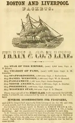 An 1853 advertisement of trans-Atlantic passenger service from Lewis Wharf.